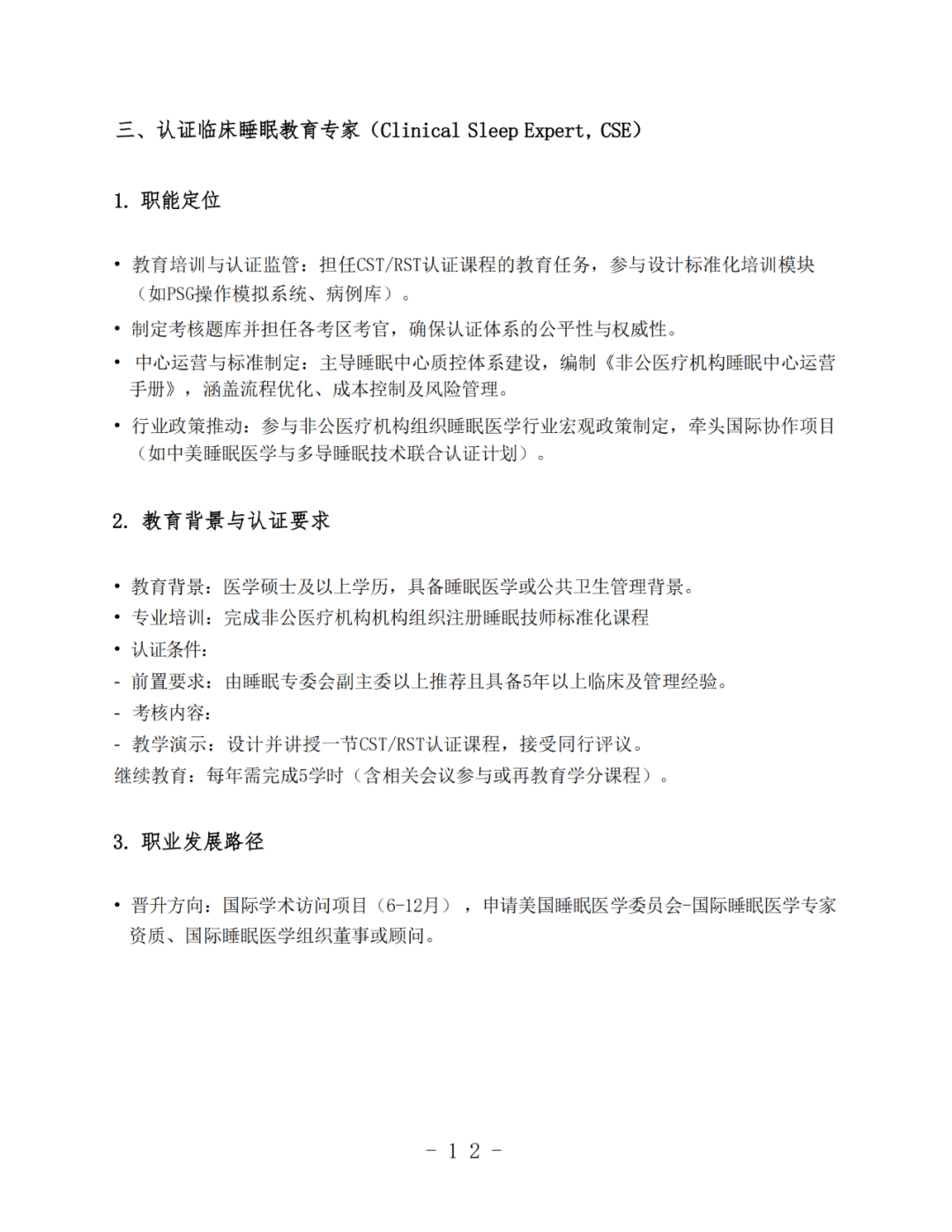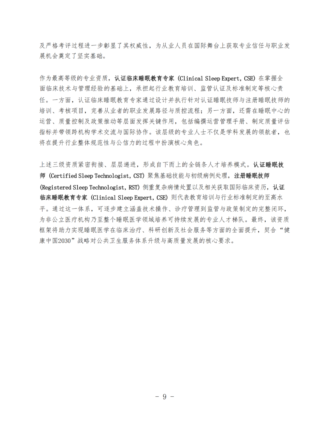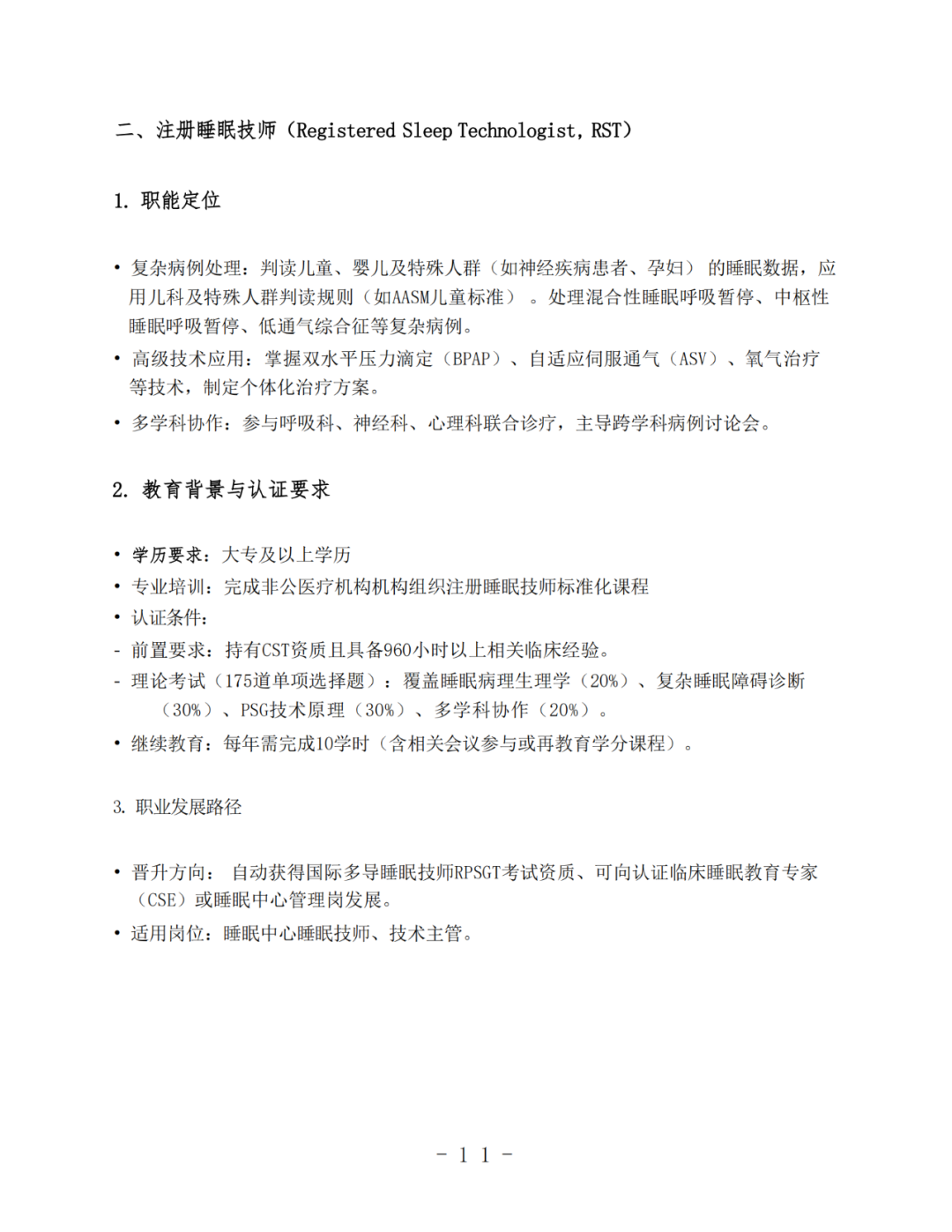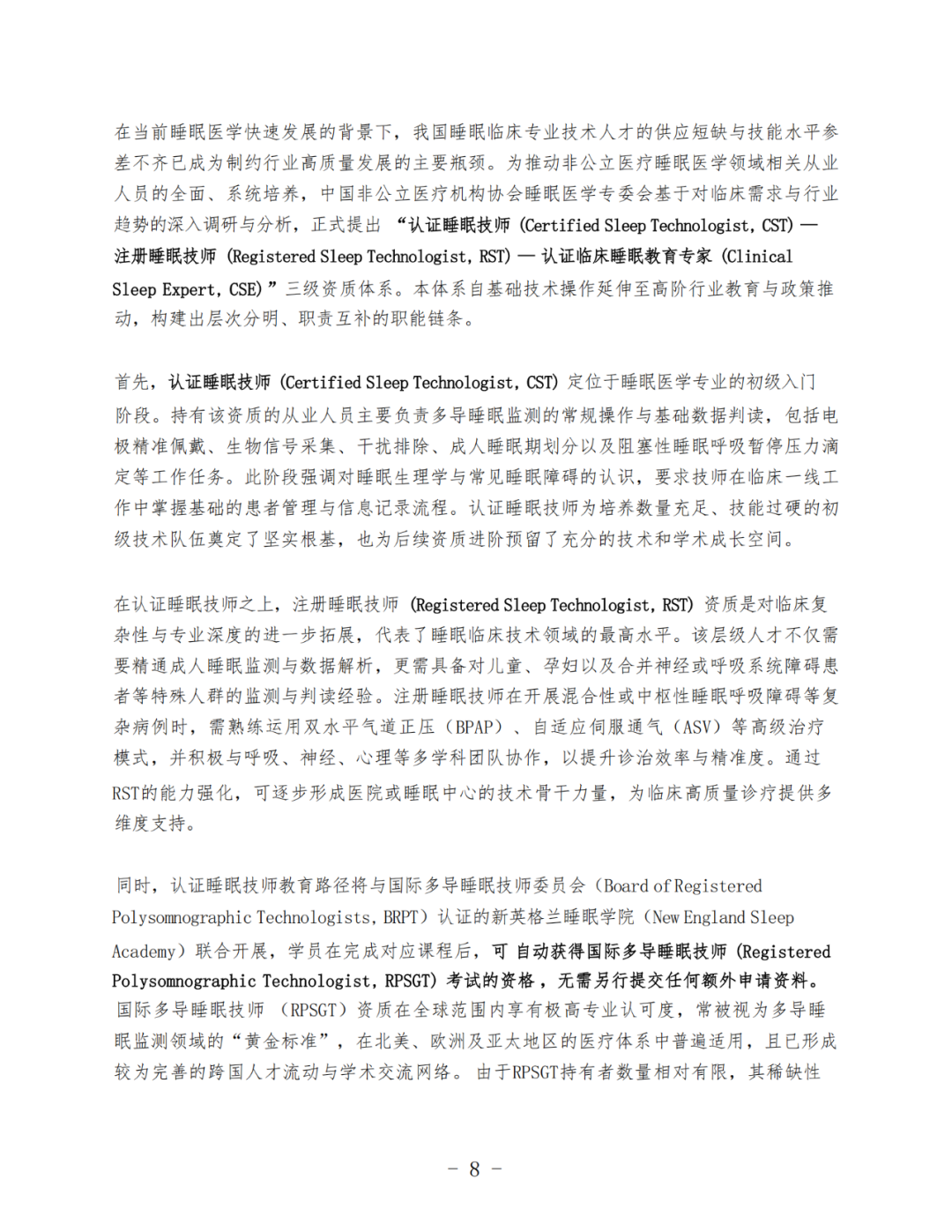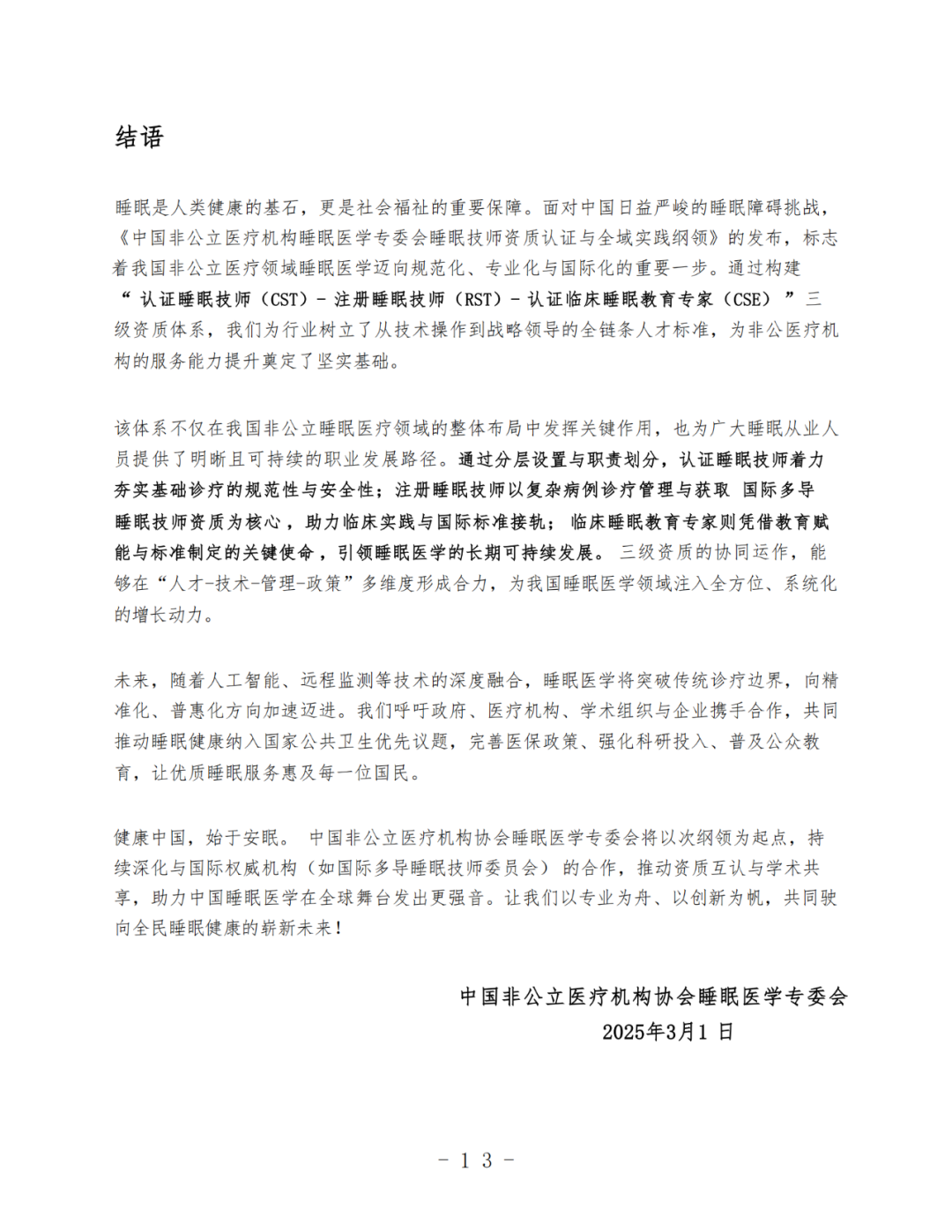 睡眠健康是关乎国民生命质量与公共卫生安全的核心议题。中国约有3亿人口受睡眠障碍困扰,而睡眠医学领域长期面临专业人才匮乏、技术标准不统一、医疗机构服务能力不足等挑战。为响应“健康中国2030”战略目标,推动睡眠医学的规范化与高质量发展,中国非公立医疗机构协会、中国非公立医疗机构协会睡眠医学专业委员会正式发布“睡眠技师资质认证与全域实践大纲”,并定于2025年3月19-20日在上海举办“睡眠技师资质认证专业能力进阶项目暨首期认证睡眠技师(CST)”培训班,同期召开“睡眠医学学科标准化体系建设研讨会及睡眠医学学术交流会”,现将有关事项通知如下:睡眠技师资质认证旨在构建覆盖“技术操作-诊疗管理-教育监管”的全链条体系,以三级资质为核心,包含:“认证睡眠技师(Certified Sleep Technologist,CST)—注册睡眠技师(Registered Sleep Technologist,RST)—认证临床睡眠教育专家(Clinical Sleep Expert,CSE)三级资质体系。从基础技术操作延伸至高阶行业教育与政策推动,构建出层次分明、职责互补的职能链条,明确各级资质的职能定位、认证标准与职业发展路径。三级资质紧密衔接、层层递进,形成自下而上的全链条人才培养模式。通过体系认证培训和考核,逐步建立涵盖技术操作、诊疗管理到监管与政策制定的完整闭环,为非公立医疗机构乃至整个睡眠医学领域培养可持续发展的专业人才梯队。认证睡眠技师(Certified Sleep Technologist,CST)聚焦基础技能与初级病例处理。注册睡眠技师(Registered Sleep Technologist,RST)侧重复杂病情处置以及相关获取国际临床资历。认证临床睡眠教育专家(Clinical Sleep Expert,CSE)则代表教育培训与行业标准制定的至高水平。(三)培训地点:上海德达医院行政楼一楼(地址:上海市青浦区徐乐路109号)。(三)医疗器械、实验室设备、科研仪器、互联网、投融资等相关企业代表。(一)证书授予:全程参加学习且考试合格者将授予“认证睡眠技师(Certified Sleep Technologist,CST)”专业能力培训证书。(二)缴费方式:培训费2000元/人,协会会员单位1600元/人,请意向学员扫描下方二维码报名缴费。