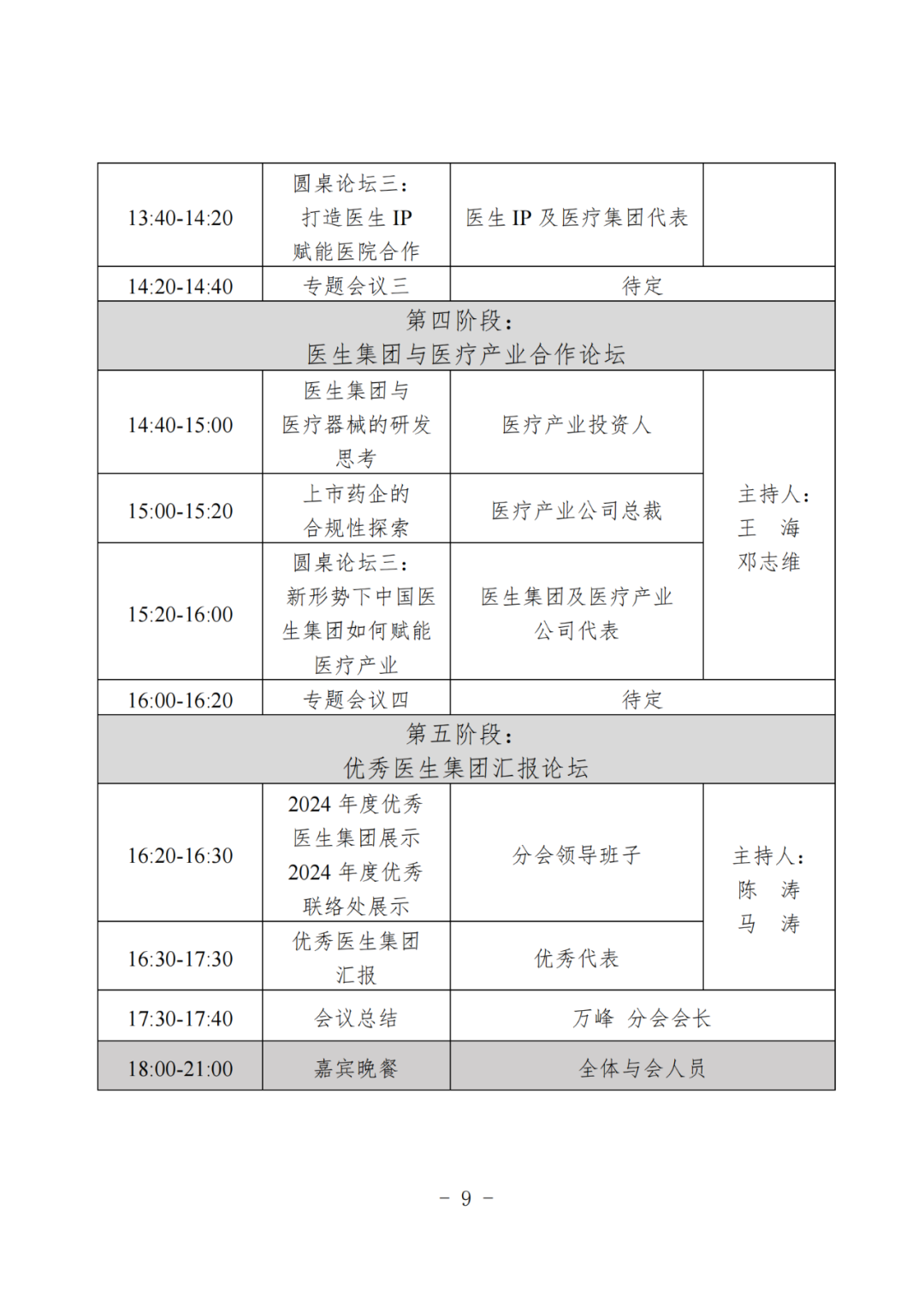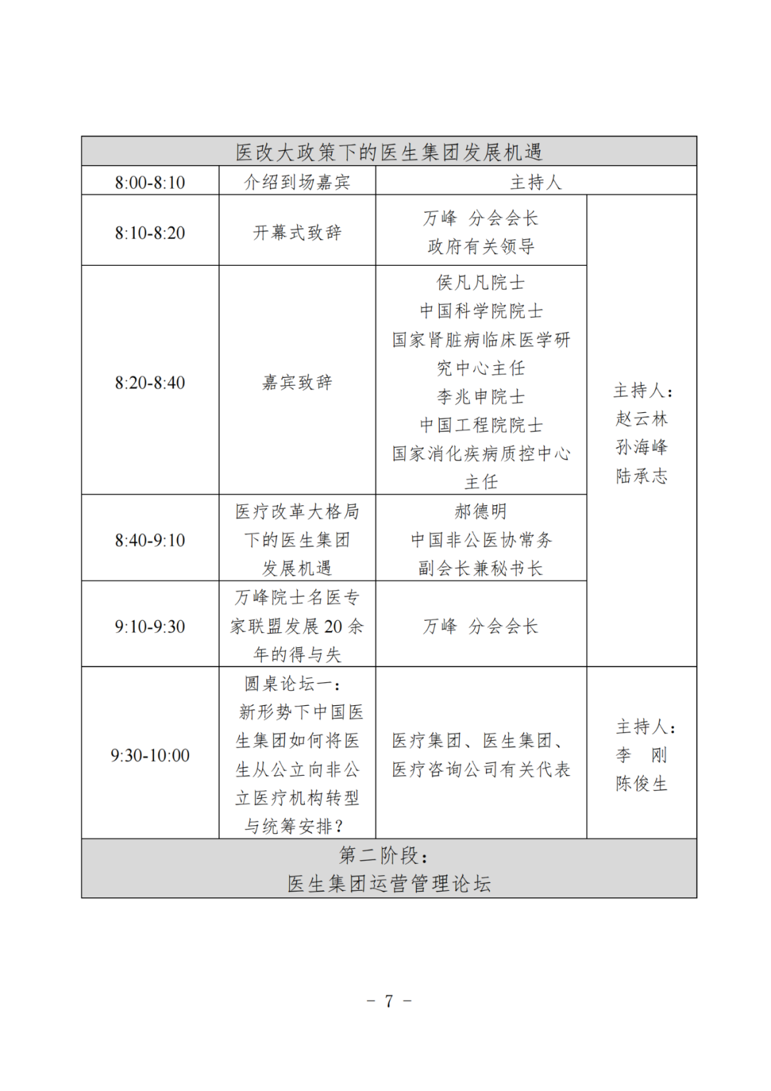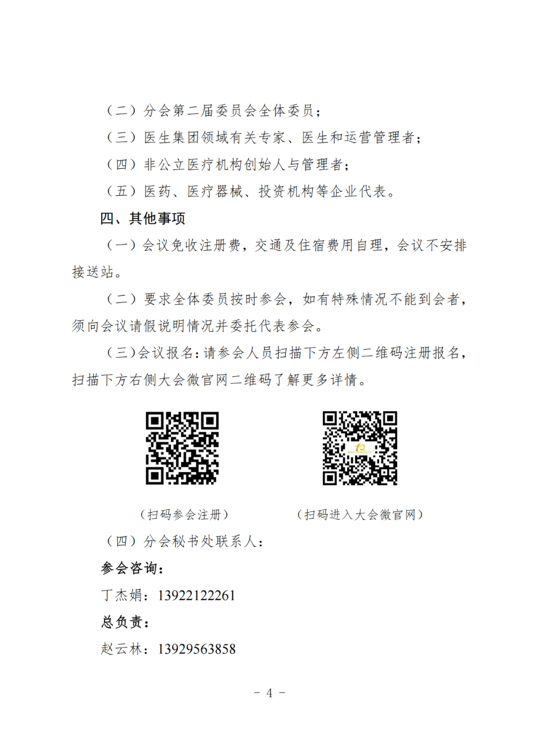 各医生集团负责人及代表、医疗机构管理者、健康产业投资人及相关企业代表:中国非公立医疗机构协会(以下简称协会)是经国务院批准成立,由依法获得医疗机构执业许可的非公立医疗卫生机构、相关企事业单位和社会团体等有关组织和个人自愿结成的全国性、行业性、非营利性独立法人社团,也是全国唯一从事非公立医疗卫生机构行业服务和管理的国家级行业组织。协会党建人事领导机关为中央社会工作部,组织登记机关为民政部,业务管理机关为国家发展改革委、国家卫生健康委和国家医疗保障局。目前,协会已正式成立75个全国性分支(代表)机构。协会医生集团分会(以下简称分会)是协会二级分支机构,于2018年6月在沪成立,并于2023年12月完成换届选举产生分会第二届委员会。分会成员主要为医生集团创始人、管理者和合作伙伴,以及非公立医疗行业管理者、优秀代表等。分会致力于探索创新医务人员使用、流动与服务新模式,主要任务包括为在非公立医疗机构多点执业的公立医院医生提供就业咨询和职业指导咨询服务、为非公立医疗机构提供专家和专家技术服务、提供支付体系和法律援助服务、为医疗研发和企业提供咨询及转化融资服务、发展壮大医生集团的执业模式等。为顺应医疗政策的变革,进一步推动医生集团行业发展与创新,促进医疗资源的优化配置与跨区域合作,分会将于2024年11月14-15日在广东省佛山市举办“医生集团分会2024年学术年会暨第二届中国医生集团发展与创新论坛”,会议将汇聚行业专家,共同探讨医生集团面临的新机遇与新挑战,并分享宝贵经验。同期11月14-17日召开“中国非公立医疗机构协会规范化高质量发展大会暨2024行业年会”。现将会议有关事项通知如下:总结医生集团分会2024年度工作成果,规划未来发展方向。(二)分会2024年学术年会暨第二届中国医生集团发展与创新论坛在三明医改、医药反腐等医疗改革的大背景下,医生集团将面临新机遇。本次大会将探索公立医院医生向非公立医疗体系的转型和统筹安排,探讨医生集团与医疗产业的合作机遇,共同交流医生集团近十年发展运营管理实践,完善医生集团运营管理线上和线下运营体系,包括但不限于专科运营、平台运营、医生IP以及品牌建设。本次大会以“优化管理·创新驱动·资源整合·提质增效”为主题,旨在提升我国非公立医疗卫生机构的管理水平、服务能力及可持续发展,打造行业交流共享平台,推进行业向规范化高质量发展迈进。(一)报到时间:2024年11月14日(周四)10:00-14:00;2024年11月14日 16:00-17:30,召开分会二届二次常务委员会议;2024年11月15日 8:00-17:40,召开分会2024年学术年会暨第二届中国医生集团发展与创新论坛;2024年11月14-17日 8:30-18:00,召开规范化高质量发展大会暨2024行业年会。(三)会议地点:和祐国际医院集团行政楼多功能厅(地址:广东省佛山市顺德区北滘镇和仁路1号行政楼)。(一)会议免收注册费,交通及住宿费用自理,会议不安排接送站。(二)要求全体委员按时参会,如有特殊情况不能到会者,须向会议请假说明情况并委托代表参会。(三)会议报名:请参会人员扫描下方左侧二维码注册报名,扫描下方右侧大会微官网二维码了解更多详情。