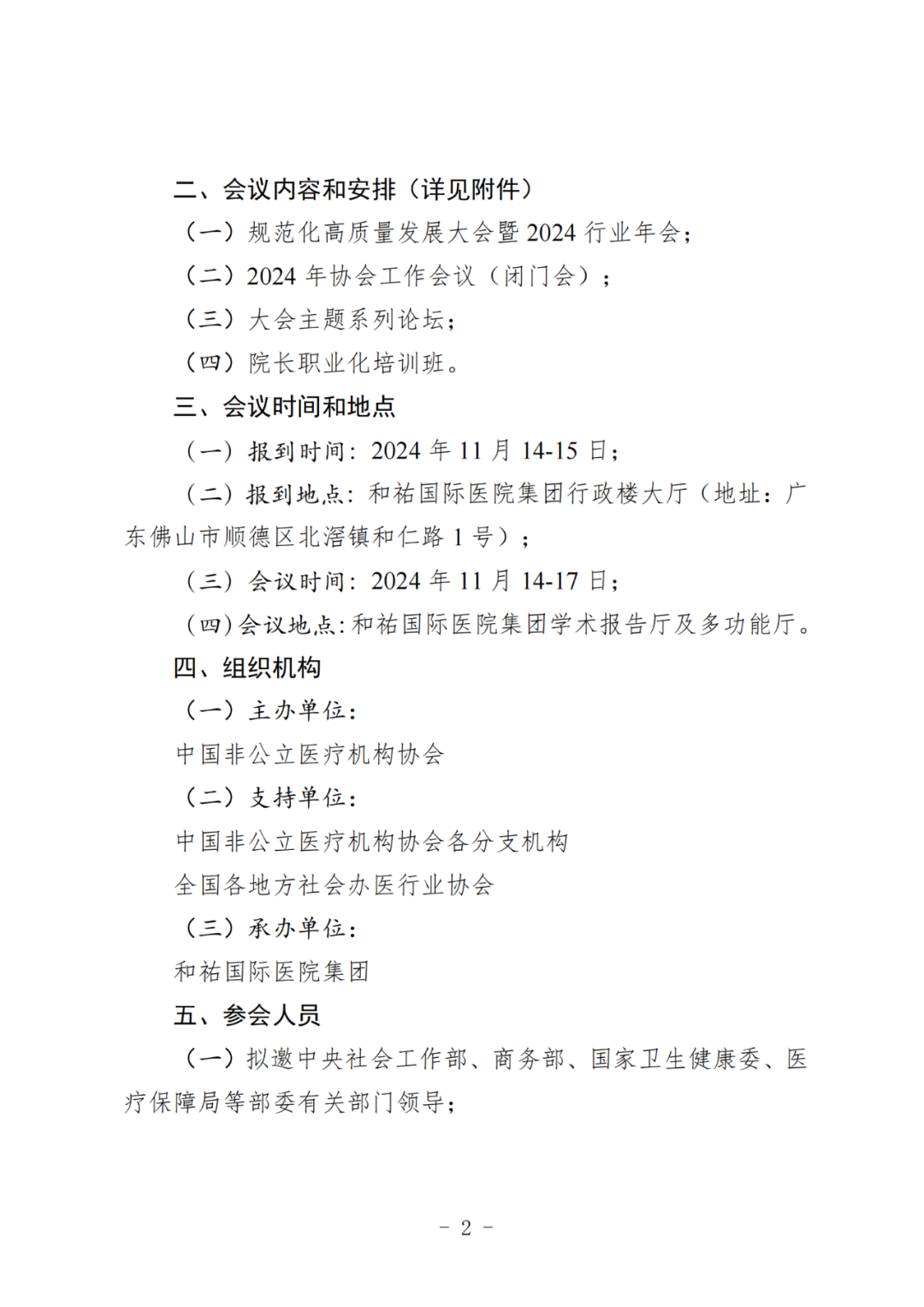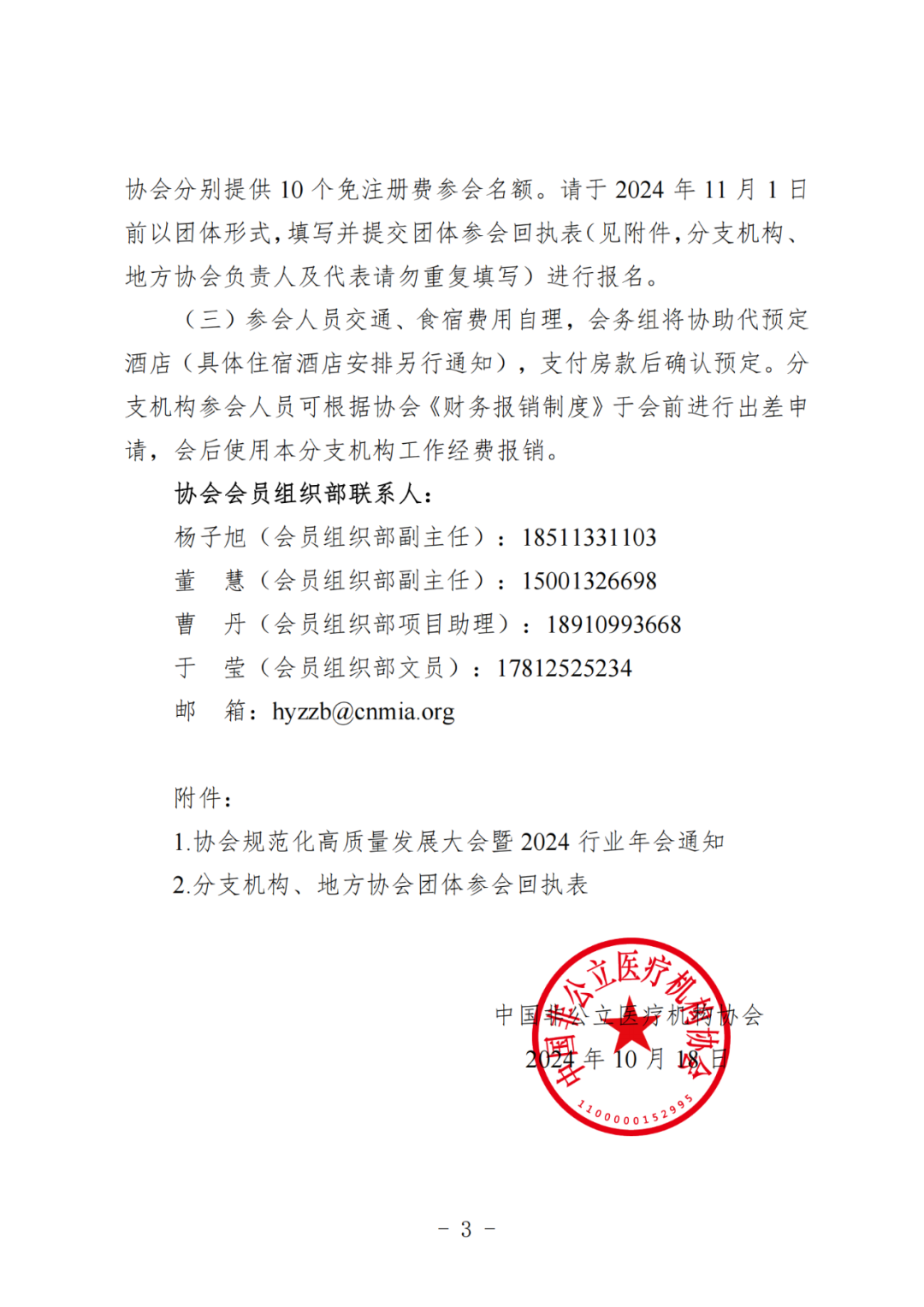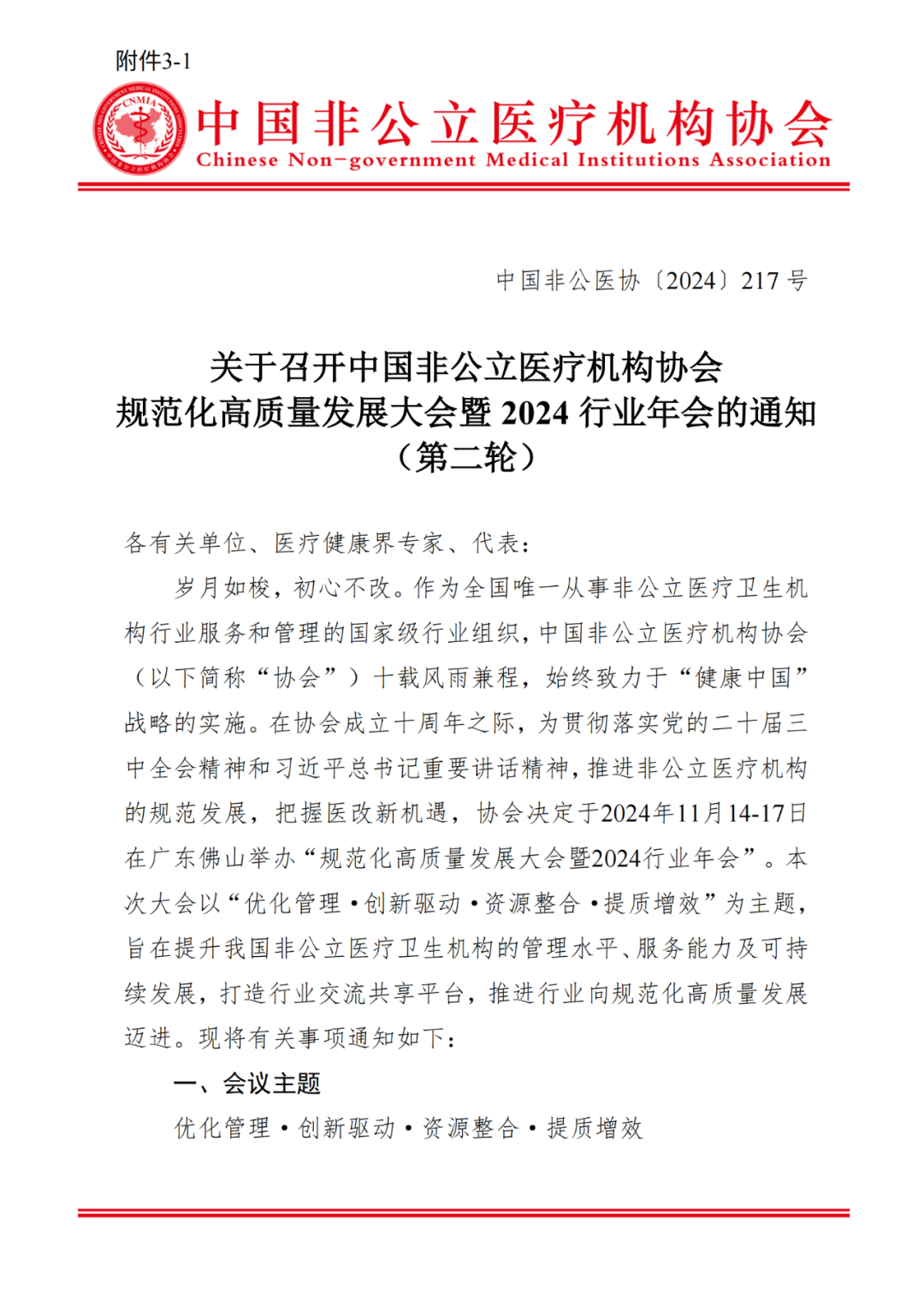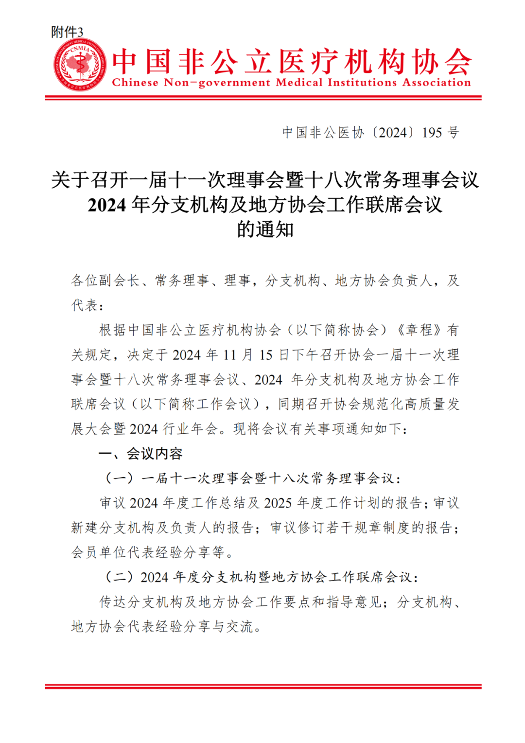 中国非公立医疗机构协会(以下简称协会)是经国务院批准成立,由依法获得医疗机构执业许可的非公立医疗机构、相关企事业单位和社会团体等有关组织和个人自愿结成的全国性、行业性、非营利性独立法人社团,也是全国唯一从事非公立医疗卫生机构行业服务和管理的国家级行业组织。协会党建人事领导机关为中央社会工作部,组织登记机关为民政部,业务管理机关为国家发展改革委、国家卫生健康委和国家医疗保障局。根据协会章程有关规定及上级主管部门有关工作要求,现启动换届工作。为贯彻落实民主办会原则,依章依规有序做好理事会换届筹备工作,现面向会员单位开展新一届理事会候选人申报工作。现将有关事项通知如下:(一)坚持党的路线、方针、政策,遵守国家法律法规;(二)理事候选人所在单位(非公立医疗机构、企业)须为协会单位会员,公立医院专家须为协会个人会员;(三)同一单位仅推荐一位理事候选人,被推荐人原则上是该单位的主要负责人;(四)具备相应的专业知识、经验和能力,熟悉行业情况,具有良好声誉形象和行业影响力;(六)组织协调能力强,热心协会工作,能够按时参加理事会议,积极建言献策、参与支持协会各项活动,志愿为行业发展贡献力量;(七)无法律法规、国家政策规定,不得担任的其他情形。请意向申请担任新一届理事会候选人的人员,认真填写《全国性行业协会商会人员审批审核表》(附件1),填表说明及样表参见附件2,并于2024年10月31日前,将签字盖章的扫描件及填写完成的ExceL版本发送至联系邮箱,纸质版原件快递至联系地址(注:原第一届理事会成员,如有意愿参选新一届理事会的,仍须重新申报)。(一)协会换届筹备工作领导小组在充分酝酿协商的基础上,经会员单位自愿申请、听取各方意见后,综合评议提出候选人建议名单,接受上级主管部门相关审查,最终提交第二届会员代表大会审议,投票选举产生协会新一届理事会。(二)新一届理事会候选人将有机会受邀列席协会一届十一次理事会暨十八次常务理事会议。会议通知见附件3。联系地址:北京市西城区西直门南大街2号成铭大厦C座24层3. 关于召开一届十一次理事会暨十八次常务理事会议的通知