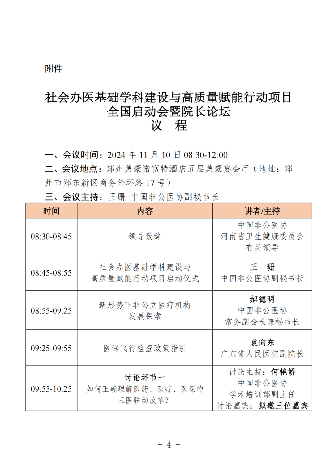 为贯彻新时代党的卫生健康工作方针,全面推进健康中国建设,加快实施健康中国行动,深化医药卫生体制改革,努力提高非公立医疗机构的管理水平和专业技术水平,推动非公立医疗机构高质量发展,加快形成与公立医院错位竞争、多元化发展的办医格局,经研究,中国非公立医疗机构协会(以下简称“中国非公医协”)决定设立“社会办医基础学科建设与高质量赋能行动项目”,并于2024年11月10日上午在河南郑州举办项目全国启动会暨院长论坛。现将有关事项通知如下:本次会议旨在探讨新形势下非公立医疗机构的发展,解析医保飞行检查政策,分析医保支付改革的精细化管理与成本效益,以及通过药事质控提升药品管理水平。同时,就三医联动改革的理解及非公立医疗机构如何实现学科、服务、市场差异化进行深入探讨。(一)会议时间:2024年11月10日08:30-12:00;(二)会议地点:郑州美豪诺富特酒店五层美豪宴会厅(地址:郑州市郑东新区商务外环路17号)。 (一)现场参会报名:本次会议免收注册费,交通食宿自理。如有意向参加,请于2024年11月5日前扫描下方二维码报名。名额有限,额满为止。
