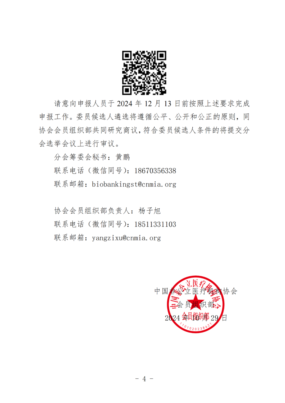 请意向申报人员于2024年12月13日前按照上述要求完成申报工作。委员候选人遴选将遵循公平、公开和公正的原则,同协会会员组织部共同研究商议,符合委员候选人条件的将提交分会选举会议上进行审议。联系邮箱:biobankingst@cnmia.org