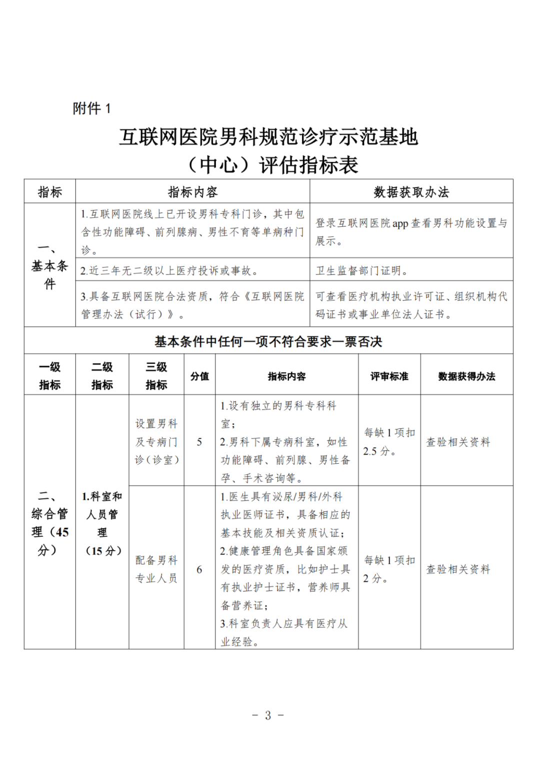 为贯彻落实中共中央、国务院印发的《“健康中国2030”规划纲要》《国务院办公厅关于促进“互联网+医疗健康”发展的意见》和国家卫生健康委《“十四五”卫生健康人才发展规划的通知》等文件精神,加快推进非公立医疗机构互联网医疗卫生健康人才队伍建设以及线上诊疗能力,中国非公立医疗机构协会旨在助力建立以专业能力为核心的诊疗体系,实施开展专业诊疗能力提升项目和相关基地建设工作。根据行业需求,依据《互联网诊疗管理办法(试行)》《互联网医院管理办法(试行)》《远程医疗服务管理规范(试行)》,为进一步加快互联网医院男科规范诊疗的落实,推动非公立医疗机构相应人才队伍的建设,现启动互联网医院男科规范诊疗示范基地(中心)申报工作。现将有关事项通知如下:中国非公立医疗机构协会男科专业委员会将于申报工作开始之后同步开启评审工作,评审工作采取实地+线上相结合的形式,符合申报要求的医疗机构将定期公布名单予以公示。1.互联网医院男科规范诊疗示范基地(中心)评估指标表