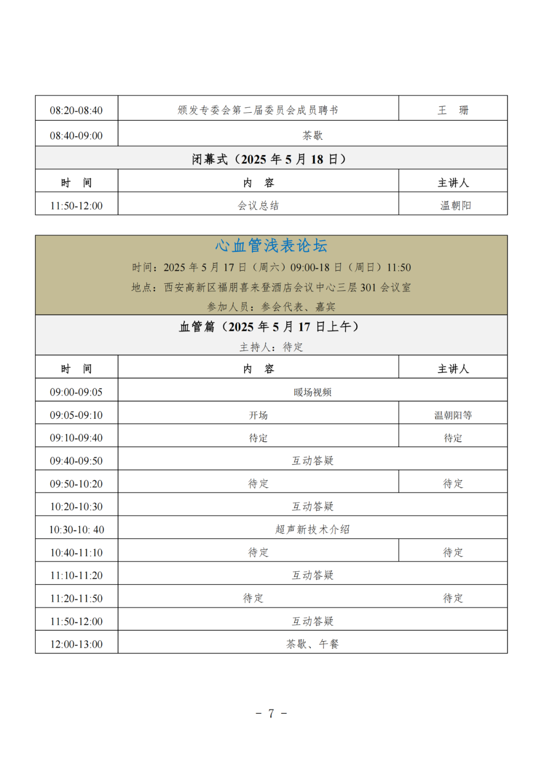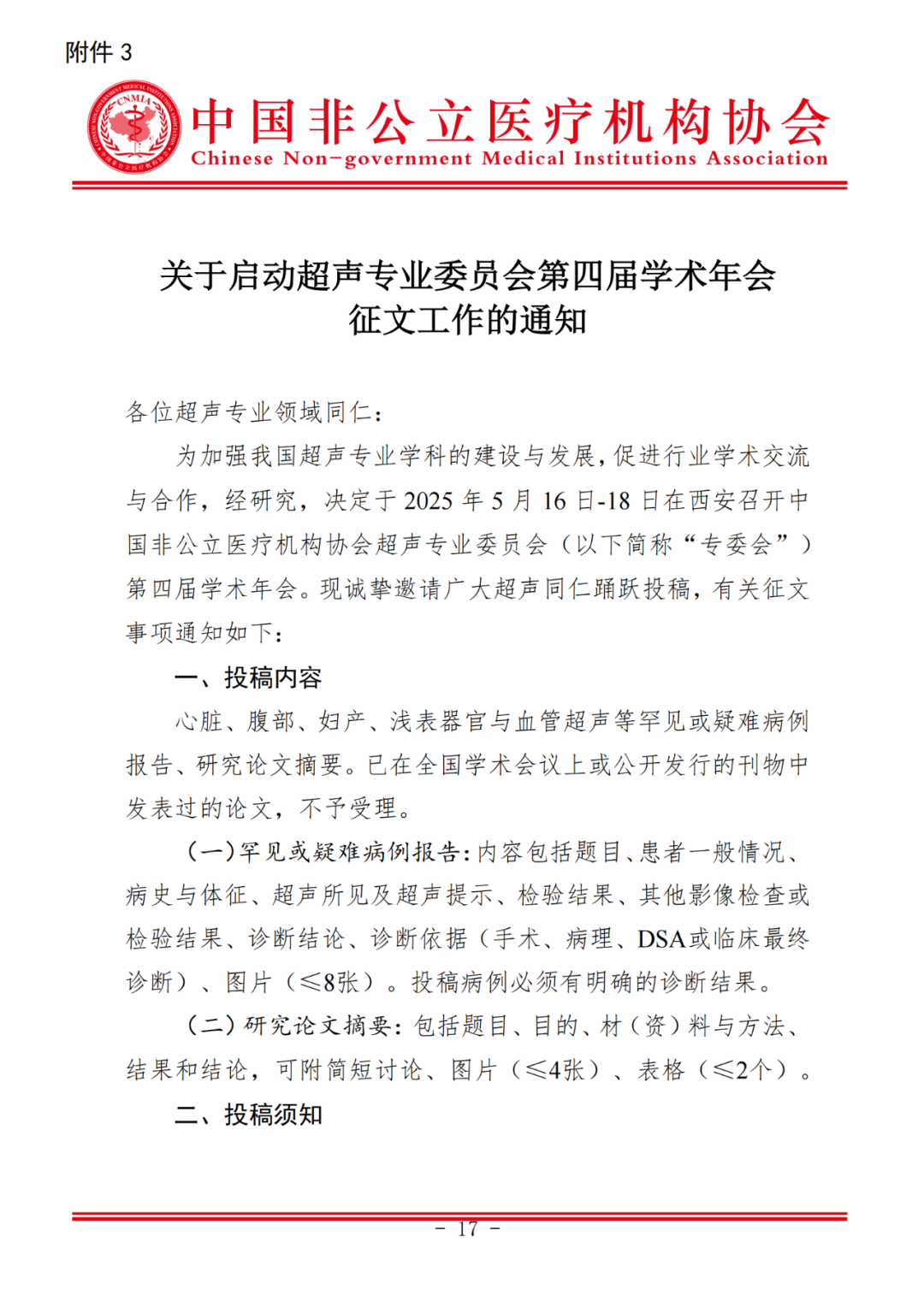 为加强我国超声专业学科的建设与发展,促进行业学术交流与合作,经研究,决定于2025年5月16日-18日在西安召开中国非公立医疗机构协会(以下简称“中国非公医协”)超声专业委员会(以下简称“专委会”)第四届学术年会,同时,根据中国非公医协《章程》、《分支机构管理办法》等有关规定,经报中国非公医协批准,决定于年会期间举办专委会换届选举会议。现将会议有关事项通知如下:1.报到时间:2025年5月16日9:00-22:00;2.报到地点:西安高新区福朋喜来登酒店大堂(地址:陕西省西安市高新区西太路900号丝路(西安)前海园8号楼)。 (二)专委会换届选举会议暨二届一次全体委员会议、二届一次常务委员会议1.会议时间:2025年5月16日16: 30-18:50;2.会议地点:西安高新区福朋喜来登酒店会议中心三层会议室。1.所有参会代表均需缴纳注册费,4月30日之前,普通参会代表缴费为600元/人,学生代表缴费为400元/人;5月1日之后(含现场注册),普通参会代表缴费为800元/人,学生代表缴费为600元/人。注册费含会议资料、会议用餐等费用。2.入选“青年论坛”发言者,则免收注册费,同时大会负责城际交通及住宿费用(详见附件征文通知)。注册缴费后,因故不能参加会议者,可通过邮件、微信、短信等方式向会务组提交经本人签字的书面退款申请书,内容包括退款原因、汇款凭证、退款账号。退款将在会议结束后,由协会财务统一办理。(一)专委会第二届委员会全体委员候选人须到会参加换届选举,原则上不得请假,如委员候选人因特殊情况不能到会,须向专委会提交医院盖章的书面请假报告,并委托代表参加,专委会呈总会批准后方有效,无故缺席视为放弃候选人资格。(二)本次会议统一安排用餐,交通、住宿自理,且不安排接送机/站。联系地址:北京市昌平区中关村生命科学园北京大学国际医院超声科,邮编102206