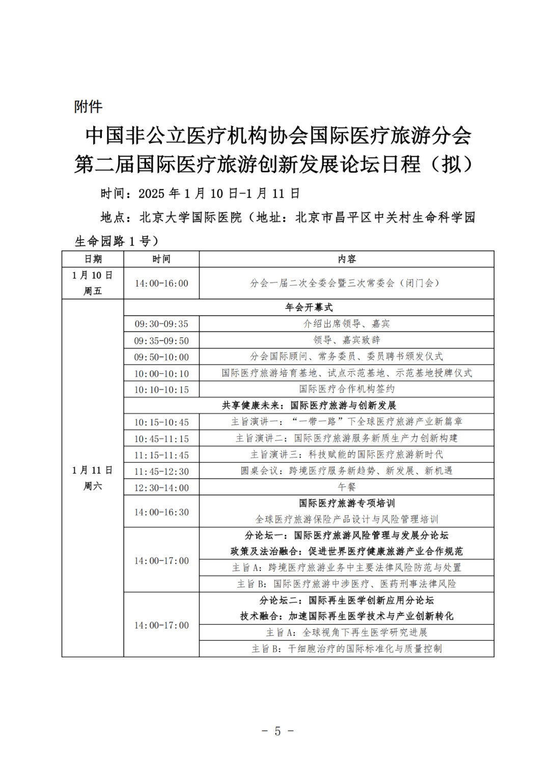 中国非公立医疗机构协会(以下简称“协会”)是经国务院批准、在民政部注册登记的,全国唯一从事非公立医疗卫生机构行业服务和行业管理的国家级行业组织。协会国际医疗旅游分会(以下简称“分会”)自2023年5月30日成立以来,在推动行业规范、促进国际旅游行业交流、培养专业人才等方面取得了显著成效,不仅为行业树立了新标杆,也为国际医疗旅游的健康发展提供了坚实的基础。为进一步推动国际医疗旅游领域交流与合作,促进医疗服务国际化发展,搭建国际医疗旅游业务平台,整合聚集海内外特色优质资源,探讨国际医疗旅游领域最新趋势、创新模式以及合作机会,经研究,兹定于2025年1月10-11日在北京市召开分会第二届国际医疗旅游创新发展论坛,现将会议有关事宜通知如下:报到时间:1月10日 13:00-17:00,1月11日 7:30-9:00(二)会议地点:北京大学国际医院(地址:北京市昌平区中关村生命科学园生命园路1号)。(三)国际医疗旅游领域专家、学者、各医疗机构相关负责人;(四)医疗机构、中介机构、保险机构、旅游机构等相关单位代表。(一)会议注册:协会会员单位免会议注册费,非会员单位注册费200元/人,含会议资料费、会议期间午餐;(二)专项培训班注册:协会会员单位注册费200元/人,非会员单位注册费300元/人;会议报名:请各位参会人员务必于2025年1月6日前扫描下方二维码报名。