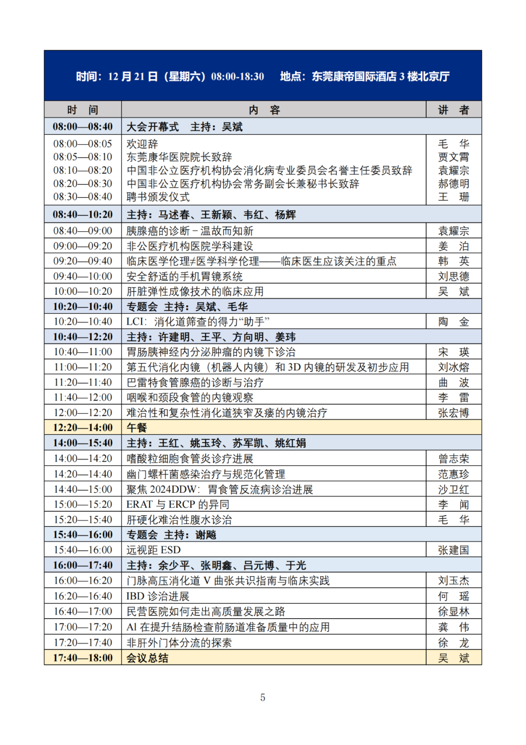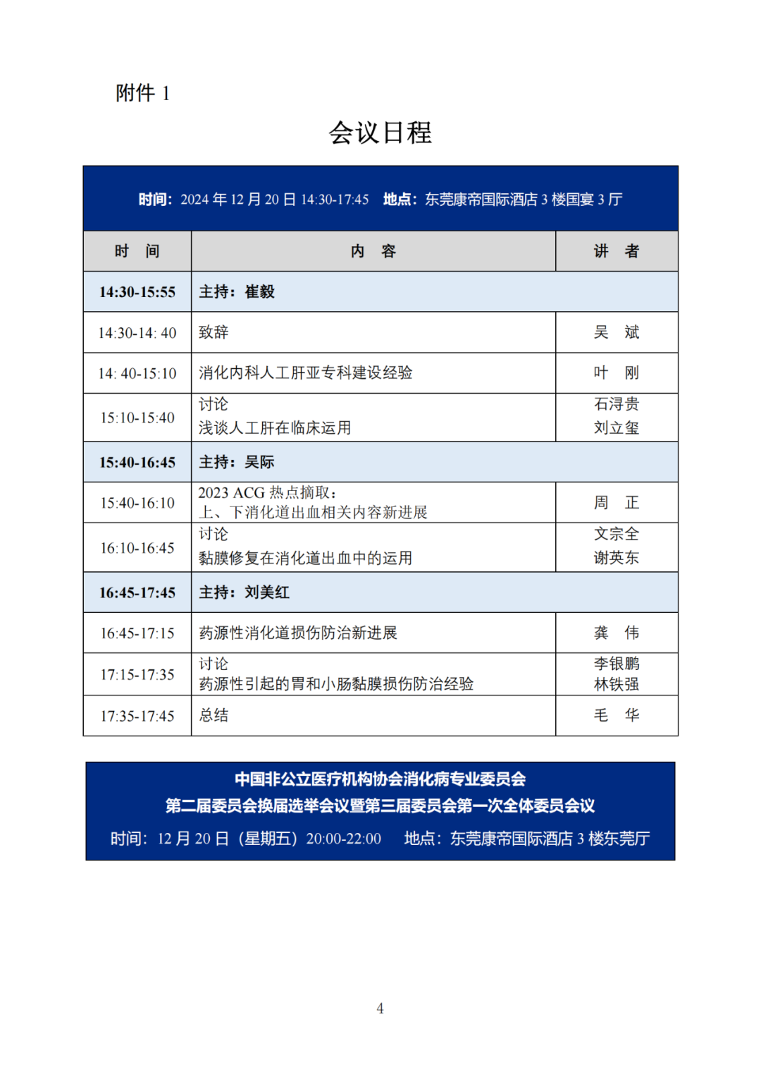 中国非公立医疗机构协会(以下简称“协会”)消化病专业委员会(以下简称“专委会”)2024年年会暨消化系疾病最新诊治指南及进展学习班定于2024年12月20-22日在广东省东莞市东莞康帝国际酒店召开,同时,根据《章程》《分支机构管理办法》等有关规定,经报总会批准,决定于年会期间召开专委会换届选举会议。有关事项通知如下:(一)专委会第二届委员会换届选举会议暨第三届委员会第一次全体委员会议:1.报到时间:12月20日14:00-19:00;2.会议时间:12月20日20:00-22:00;3.会议内容:通报专委会第二届委员会工作报告、换届选举会议筹备情况及第三届委员会候选名单组成及产生情况、选举产生专委会第三届委员会各级成员、审议《专委会管理办法》等。(二)专委会2024年年会暨消化系疾病最新诊治指南及进展学习班:1.报到时间:12月20日07:30-12:00;3.会议内容:本次年会将聚焦消化疾病治疗的系统化、规范化与精准化进行深入研讨,以及专题分享非公立医疗机构的建设和管理经验,共同探讨当前医疗领域热点难点问题。具体议程见附件。(三)会议地点:东莞康帝国际酒店(地址:广东省东莞市南城区鸿福路200号海德广场)。(一)本次会议免收注册费,参会人员交通、住宿费用自理,不安排接送机/站。请于12月10日前扫描下方二维码注册报名。