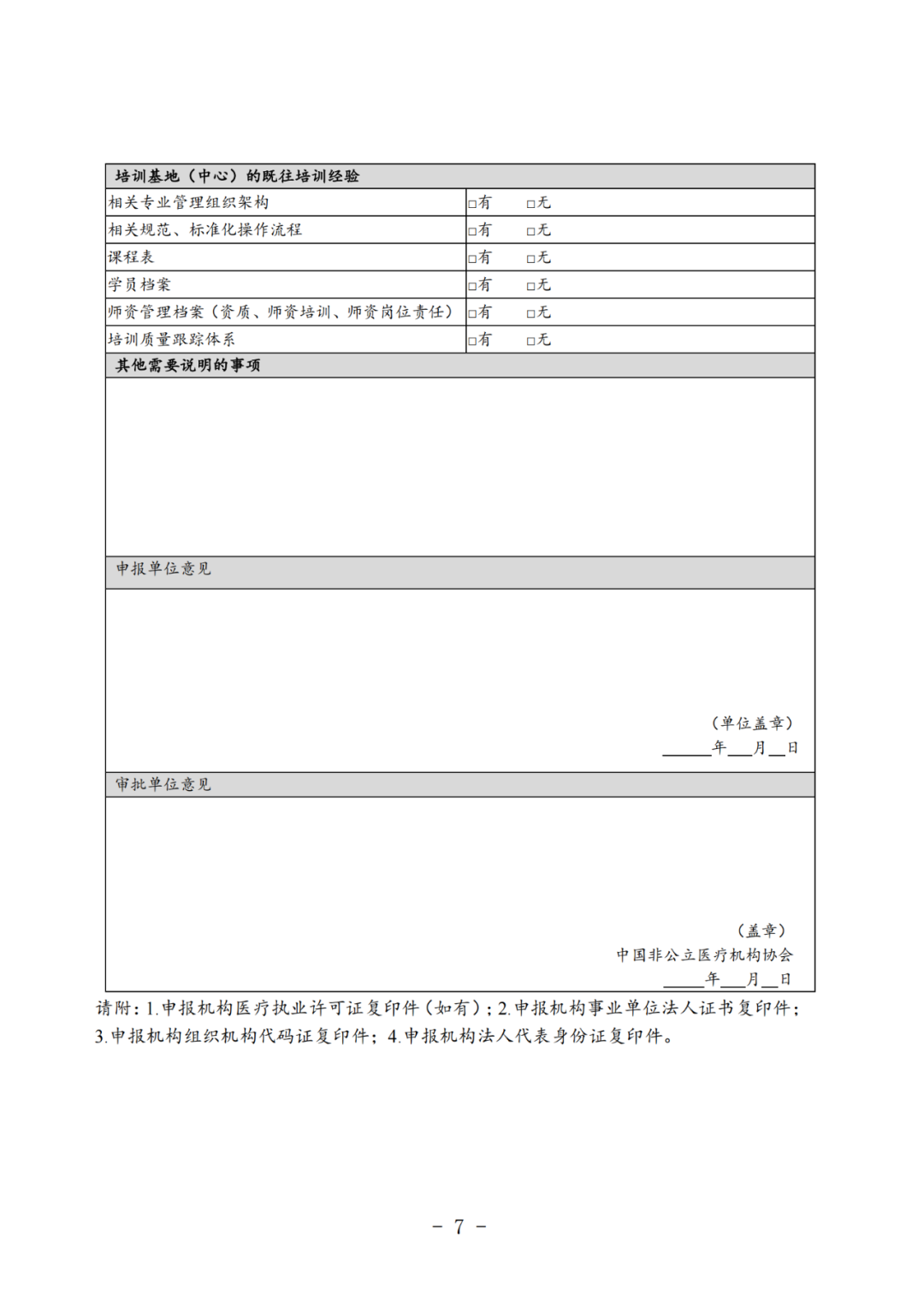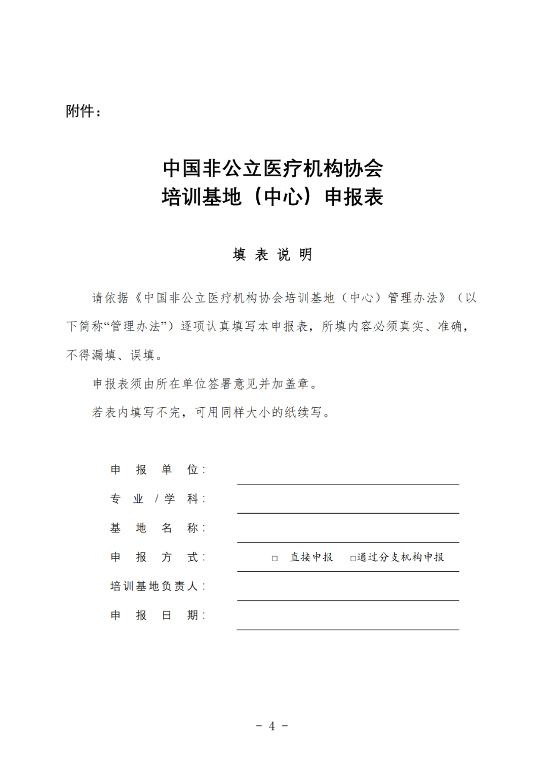 为贯彻落实中共中央、国务院印发的《“健康中国2030”规划纲要》和国家卫生健康委《“十四五”卫生健康人才发展规划的通知》(国卫人发〔2022〕27号)等文件精神,加快推进非公立医疗机构卫生健康人才队伍建设,中国非公立医疗机构协会建立以专业能力为核心的培训体系,实施开展专业能力培训项目和相关培训基地建设工作。随着人口老龄化的加剧,老年骨质疏松问题日益凸显,其预防与治疗已成为医疗健康领域的重点关注对象。为进一步提高骨质疏松领域相关从业人员的诊疗水平,推广促进骨骼健康的康复技术,提升患者的治疗效果,中国非公立医疗机构协会特设立了“骨质疏松规范化诊疗专业能力培训项目”(以下简称“项目”)。根据行业需求,为进一步加快项目和培训基地的落实,推动相应人才队伍的建设,现启动骨质疏松规范化诊疗专业能力培训基地申报工作,并将有关事项通知如下:面向国内所有已开展骨质疏松相关诊疗工作的非公立医疗机构。学术指导:中国非公立医疗机构协会骨质疏松规范化诊疗专业能力培训项目专家委员会各申报单位可根据实际情况进行申报,先提交培训基地申报表(详见附件),项目专家委员会根据申报情况适时下发基地评估要求、评审时间和评审专家等信息。协会将于申报工作开始之后同步开启评审工作,评审工作采取实地+线上相结合的形式,符合申报要求的医疗机构将定期公布名单予以公示。邮 箱:training@cnmia.org,1954396221@qq.com