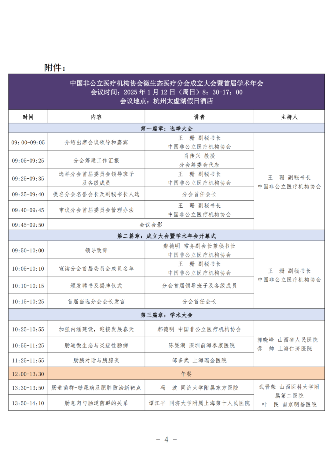 为进一步加强我国微生态医疗领域的建设与发展,促进行业学术交流与合作,经研究,我会决定成立微生态医疗分会,并定于2025年1月12日在浙江杭州举办“中国非公立医疗机构协会微生态医疗分会(以下简称“分会”)成立大会暨首届学术年会”。本次学术年会将以“菌群新世界,医疗新蓝海”为主题,针对微生态医疗行业难点和热点问题进行学术探讨。现将会议有关事项通知如下:(一)报到时间:2025年1月11日下午15:30-19:00;1. 1月12日09:00-09:50,召开分会选举大会,分会全体委员候选人参加;2. 1月12日09:50-17:00,召开分会成立大会暨首届学术年会,全体人员参加。(三)会议地点:杭州太虚湖假日酒店(地址:杭州市萧山区义桥镇太虚湖假日酒店)。(一)分会全体委员候选人须到会参加选举,如有特殊情况不能到会者,须向会议请假说明情况并委托代表参会,无故缺席视为放弃委员候选资格。(二)本次会议免收注册费用,交通及食宿费用自理,会议不安排接送机/站,请于2025年1月9日前扫描下方二维码完成会议报名。如需代预定会议酒店,请务必在报名时勾选。