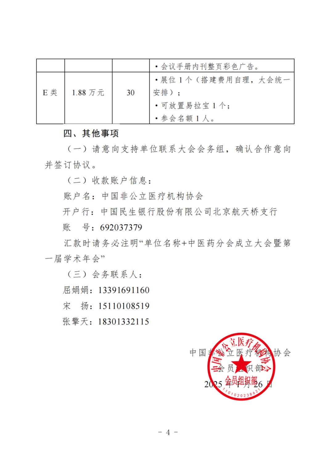 为促进新时代中医药传承创新发展,整合公立与非公立医疗机构中医药资源,加强行业学术交流与合作,推进中医药科技创新,引领中医药医疗、教学、科研和企业深度融合,进一步推动我国中医药产业高质量发展,经研究,中国非公立医疗机构协会启动了中医药分会筹建工作,并计划于2025年上半年召开中国非公立医疗机构协会中医药分会成立大会,同期将举办第一届学术年会。届时将邀请国家有关部门领导、中医药领域知名专家及企业代表等围绕中医药最新研究进展、学科建设、教育培训、适宜技术应用等方面进行学术交流与探讨。现诚邀各有关单位合作支持,会议有关信息及合作事项如下: